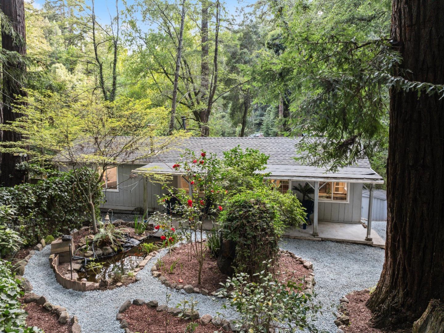 This charming 3-bed, 1-bath home, accompanied by a possible income-producing 1-bed/1-bath ADU, offers a picturesque riverside living experience in Redwood Grove. Situated along the San Lorenzo River, the primary residence features vaulted ceilings and a lovely wood-burning fireplace to welcome you into the living space. The modern kitchen with granite countertops, tile backsplash, and stainless appliances overlooks the serene trees and creek for serenity even when cooking. The bathroom is elegantly updated with a restored clawfoot tub for luxurious nights in. Watch serene koi and turtles in the meticulously maintained 800-gallon koi pond with surrounding lush flora. A large back deck for hosting guests and alfresco dining while listening to the river, and fire-safe entry doors. The property boasts new lighting, insulation, fresh paint, and mini-splits in both units. Ample parking spaces and proximity to Garrahan Park, Saw Mill Restaurant Big Basin Redwood State Park, and Highway 9 make commuting effortless. Downtown Boulder Creek for local shops, restaurants, and lively community events. This mountain gem, complete with an income producing ADU, epitomizes charm and comfort.